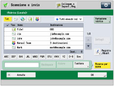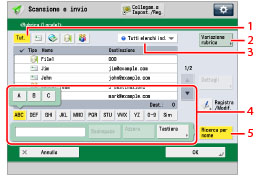 1 | Pulsante di selezione del tipo di destinazione Premere [Tut.], (E-mail), (I-fax), (File), (Gruppo) per visualizzare le destinazioni registrate per ciascun tipo. |