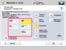 → [Scansione e invio] → specificare la destinazione → premere il pulsante del formato del file.