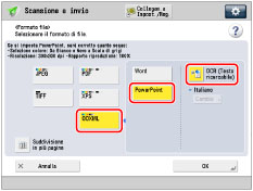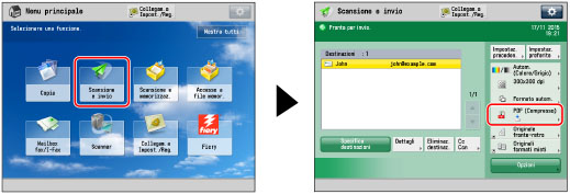 → [Scansione e invio] → specificare la destinazione → premere il pulsante del formato del file.