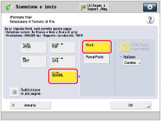 Se si seleziona il formato file PDF (OCR), XPS (OCR) o OOXML (OCR) e <Riconoscimento automatico> è impostato su 'On' in [Impostazioni OCR (Testo ricercabile)] (Impostazioni/Registrazione), l'orientamento dell'originale viene riconosciuto e, se necessario, il documento viene ruotato automaticamente prima di essere inviato. (Vedere "Impostazioni per la creazione di PDF/XPS/OOXML ricercabili".) Se si seleziona [OCR (Testo ricercabile)], è possibile inviare solo con un rapporto di zoom di [1:1 (100%)] o [Autom.]. Se si seleziona PDF o XPS come formato file, è possibile impostare [Compresso] e [OCR (Testo ricercabile)] contemporaneamente. In questo caso, come formato file nella schermata Funzioni di base Scansione e invio viene visualizzato [PDF (Compresso)] o [XPS(Compresso)]. Se si seleziona [Word] per [OOXML], è possibile impostare di eliminare le immagini di sfondo acquisite. È possibile generare file Word facili da modificare senza immagini indesiderate. (Vedere "Eliminazione delle immagini di sfondo durante la generazione di file Word".) |