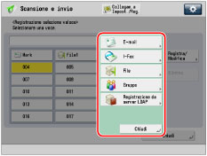 Le seguenti icone vengono visualizzate per indicare il tipo di destinazione registrato per i pulsanti di selezione veloce in cui è già stata registrata una destinazione:  (E-mail)  (I-fax)  (File server)  (Gruppo) |