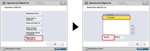 Premere [Registrazione certificato CA] → selezionare il nome del file → premere [Registra].
