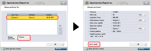 Selezionare la coppia di chiavi per il certificato CA da controllare → premere [Dettagli certificato] → [Verif. certif.].