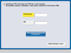 Se si imposta <Consentire lav. copiatu- ra/stampa bianco e nero> su 'On', sulla schermata di immissione dell'ID divisione e del PIN viene visualizzato [Copia/stampa in nero].