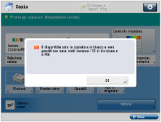 Se viene premuto [Copia/stampa in nero] quando [Consentire lav. copiatu- ra/stampa bianco e nero] è impostato su 'On', nella schermata Funzioni di base copia viene visualizzato un messaggio che indica che è possibile solo la copia in bianco e nero.