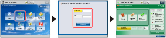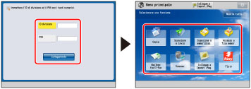Come schermata predefinita visualizzata dopo l'avvio/ripristino viene visualizzata la schermata specificata in "Schermata predefinita dopo avvio/ripristino". La schermata di accesso viene visualizzata quando si selezionano funzioni il cui uso è limitato. Per utilizzare ciascuna funzione immettere l'ID divisione e il PIN.
