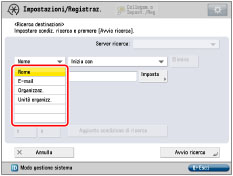 È possibile utilizzare organizzazione/unità organizzativa come categorie di ricerca solo se le informazioni sono state registrate nel server LDAP. L'organizzazione/unità organizzativa potrebbe non essere eseguita, a seconda che i tipi di attributo siano stati registrati o meno nel server LDAP e a seconda del tipo di applicazione sul server. |