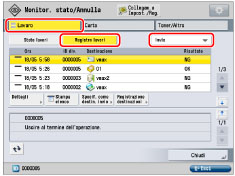 Per ricevere un messaggio di conferma che comunica lo stato della distribuzione del documento I-fax, la macchina del destinatario deve disporre di funzioni I-fax ed essere compatibile con il modo Full. Se si trasmette un documento nel modo Full a una macchina che non supporta il modo Full, non sarà possibile ricevere alcun messaggio di conferma ricezione. In tal caso, il lavoro relativo non viene considerato completato anche se il documento è stato trasmesso con successo. Per questi lavori viene indicato <In attesa risultato TX> nella schermata Stato finché non è trascorso il periodo di tempo impostato per [Timeout TX modo Full] in [Impostazioni e-mail/I-Fax] in [Impostazioni funzione]. Allo scadere del tempo impostato per [Timeout TX modo Full], il lavoro viene spostato nel registro ed il risultato viene indicato con <-> se non è stato possibile verificare la trasmissione del documento inviato ad un server o a un'altra destinazione. (Vedere "Timeout TX modo Full".) È possibile verificare lo stato di consegna del documento premendo → [Lavoro] → [Registro lavori] → [Invio]. Se il documento è stato ricevuto con successo, verrà visualizzato [OK], se invece l'invio non è riuscito, verrà visualizzato [NG] e, se non è possibile verificare i risultati, verrà visualizzato [--]. Nel modo Semplice, la conferma di consegna è disattivata. Anche se la consegna ha avuto successo, verrà visualizzato [--].![]() |