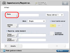 Dopo avere selezionato [OK], il campo standard impostato viene visualizzato come una serie di asterischi (********) nella schermata di impostazione I-fax. Anche se <Invio tramite server> è impostata su 'Off', la conferma di consegna dei documenti inviati con il modo Full avviene tramite il server. |