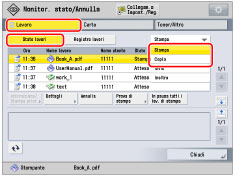 Quando l'esempio viene consegnato, la macchina elabora automaticamente il lavoro di stampa. Se è necessario regolare le impostazioni, premere [Annulla] o [In pausa tutti i lav. di stampa] ed effettuare la regolazione necessaria. |