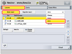 [Ritrasmis- sione]: | Ritrasmette il lavoro. Se si seleziona un lavoro con più destinazioni, premere [Elenco trasmis. seq.] → selezionare la destinazione alla quale ritrasmettere il lavoro → premere [Ritrasmis- sione]. |