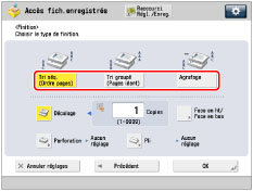 Pour plus d'informations sur les produits en option, voir les rubriques suivantes : Si l'option [Finition] n'est pas réglée, les feuilles sont déposées de la même façon que lorsque l'option [Tri groupé (Pages ident)] est réglée. Il est possible d'afficher les informations détaillées sur le papier sélectionné en appuyant sur [Détails]. |