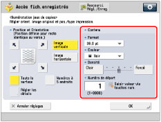 Si l'option <Option numérot.> est réglée sur "Oui" sous [Régl. options numérot. jeux de copies], la taille des numéros de jeux de copies peut être réglée sur [10,5 pt], [12,0 pt] ou [14,0 pt]. (Voir "Options de numérotation des jeux de copies".) |