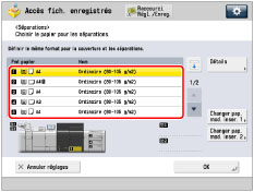 Si l'utilisateur appuie sur [Détails], les informations détaillées sur le papier sélectionné s'affichent. Si on appuie sur , on peut choisir d'afficher ou non l'illustration de périphérique. Pour plus d'informations, voir "Changement de l'affichage par défaut de l'écran de sélection de la liste des papiers ". |