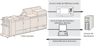 L'enregistrement de la licence peut être nécessaire, selon l'option système. Selon l'option système, il est possible de télécharger le manuel ou les logiciels correspondants depuis l'URL suivante. http://canon.com/fau/downloads Lors du téléchargement des manuels et des logiciels des options système, préparer le certificat du numéro d'accès à la licence inclus dans le module. Si aucun manuel n'est proposé au téléchargement, voir la description de la fonction dans le présent manuel. La fonction "Enregistrer/Mettre à jour logiciel" ne peut pas être utilisée par plusieurs personnes à la fois. |