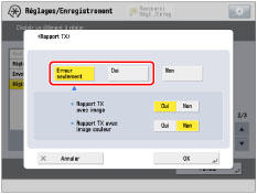 Si l'on souhaite faire figurer une partie du document envoyé dans le Rapport d'émission (TX), régler <Oui> sur [Rapport TX avec image].