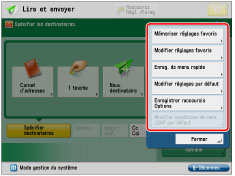 Pour plus d'informations sur les écrans affichables lorsque la machine est mise sous tension, voir "Ecran par déf. après démarrage/restauration". Les réglages disponibles peuvent varier selon les droits de l'utilisateur. Pour plus d'informations sur l'enregistrement et la modification des réglages favoris, voir les points suivants : Mémorisation/modification/suppression des boutons Réglages favoris pour Lire et Envoyer Mémorisation et modification de réglages favoris pour Accès aux fichiers enregistrés Mémorisation et modification de réglages favoris pour Lire et mémoriser Pour plus d'informations sur la mémorisation des touches de raccourci de Options et Réglages favoris, voir les points suivants : Mémorisation des touches de raccourcis pour Copie Mémorisation des touches de raccourcis pour Lire et Envoyer |
