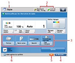 6. | L'état d'avancement des tâches et des opérations de copie ainsi que le statut des périphériques et des consommables s'affichent ici. En outre, si la gestion des numéros de service est réglée, le numéro de service utilisé pour se connecter à la machine s'affiche. |