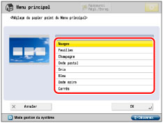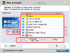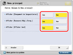 dans la partie supérieure droite de l'écran, l'écran suivant s'affiche. Sélectionner les réglages dans l'écran affiché et régler l'affichage de l'écran Menu principal.