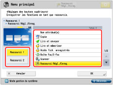 Pour définir les réglages de l'écran Menu principal, se connecter à la machine comme administrateur. Par défaut, les réglages de l'administrateur système (code administrateur système/PIN système) sont définis sur la machine. Par conséquent, l'administrateur doit se connecter en saisissant le numéro d'administrateur système et le PIN système dans l'écran Réglages/Enregistrement. Le réglage par défaut du numéro d'administrateur système et du PIN système est "7654321". Si le nombre de boutons de fonction est supérieur à la valeur définie sous <Réglages affichage bouton menu principal>, les boutons supplémentaires sont affichés sur le deuxième écran du Menu principal. L'écran du Menu principal peut contenir 16 boutons au maximum. Si l'on sélectionne [Afficher tt] dans le Menu principal, tous les boutons sont affichés dans l'ordre par défaut, même lorsque leur disposition a été modifiée. Pour revenir à l'écran personnalisé, appuyer à nouveau sur [Afficher tt]. Pour plus d'informations sur [Changer langue/clavier], voir "Activation/désactivation du changement de langue/clavier". Pour plus d'informations sur [Régl. auto dégradés], [Réglages papier] et [Réglages de gestion du type de papier] voir "Réglage automatique des demi-teintes". "Mémorisation du type et du format de papier d'une source d'alimentation", et "Présentation de cette fonction". Les sauts de ligne utilisés lors de la mémorisation des pages Web sont indiqués dans le nom des boutons de page Web à l'écran Menu principal. |