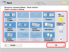 Les réglages peuvent être rappelés sans afficher un écran de confirmation depuis l'écran des fonctions de base du mode Copie.