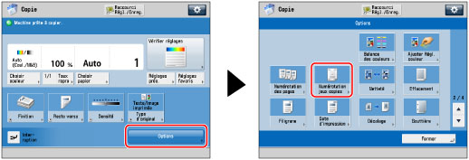 Si le mode [Option numérot.] est réglé sur "Oui", les options [Toute la surface] et [Numéros à 5 endroits] sont grisées et ne peuvent pas être sélectionnées. (Voir "Options de numérotation des jeux de copies".) Si le même emplacement d'impression du numéro est sélectionné pour n'importe quelle combinaison de deux modes parmi les suivants : [Numérotation des pages], [Filigrane] ou [Date d'impression], un message demandant la confirmation s'affiche lorsque l'on appuie sur . |