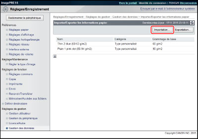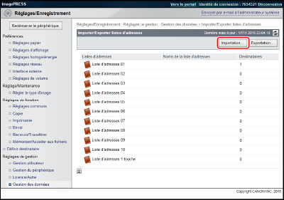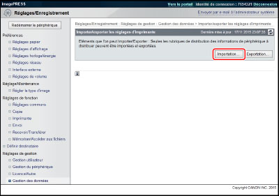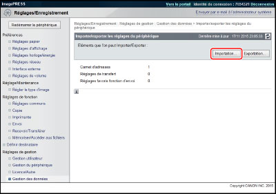 Si l'on importe une Liste d'adresses (Supprimer et remplacer) ou les réglages de transfert, les informations stockées sous [Réglages favoris] à partir du panneau de commande de la machine et la fonction Rappel sont supprimées. |