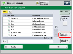 Si une recherche de nouveaux destinataires est effectuée alors que les résultats d'une recherche sont déjà affichés dans l'écran de la liste des destinataires, ces résultats sont effacés. Si le résultat de recherche d'un critère donné s'affiche, il s'efface puis la recherche de tous les critères se lance lorsque l'on appuie sur [Ttes]. Si [Rech. auto si utilisation serveur LDAP] est réglé sur "Non", l'écran présentant la liste des destinataires reste vide jusqu'à ce qu'une recherche soit effectuée. Si le résultat de recherche de [Rech. par conditions] s'affiche à l'écran de la liste des destinataires, il est impossible d'appuyer sur [Rechercher par nom] pour affiner la recherche par nom. |
