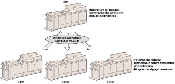 La préparation de la distribution et de la mise à jour des informations après leur réception peut prendre quelques minutes. Ne pas mettre la machine hors tension tant que ces opérations ne sont pas terminées, faute de quoi la machine risque de ne pas fonctionner correctement. Les informations de périphérique peuvent être partagées entre les machines du même modèle. Cependant, certaines informations risquent de ne pas être distribuées correctement selon les produits en option disponibles sur la machine. Si [Restr. réception infos périphérique] pour <Réglages de réception> est défini sur "Non", la machine peut recevoir les informations de périphérique distribuées à partir de différents modèles de machine. (Voir "Réglage de la machine en réception".) Cependant, il est possible que certaines informations ne soient pas distribuées correctement. Les informations de périphérique ne sont pas fournies si le code administrateur système et le PIN système de la machine cliente sont différents de ceux de la machine hôte. |