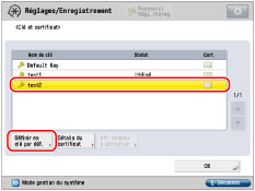 Une biclé et un certificat de serveur sont préinstallés sur la machine. Il est possible d'effectuer des communications TLS cryptées à l'aide de la biclé et du certificat de serveur préinstallés. Le nom de la biclé préinstallée est "Default Key". Il est possible de vérifier le certificat en appuyant sur [Détails du certificat]. Il est possible de vérifier la raison d'utilisation de la clé en appuyant sur [Aff. emplac. d'utilisation]. |