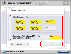 Sélectionner l'algorithme de chiffrement et la restriction DSA à utiliser. → Appuyer sur [OK].