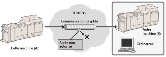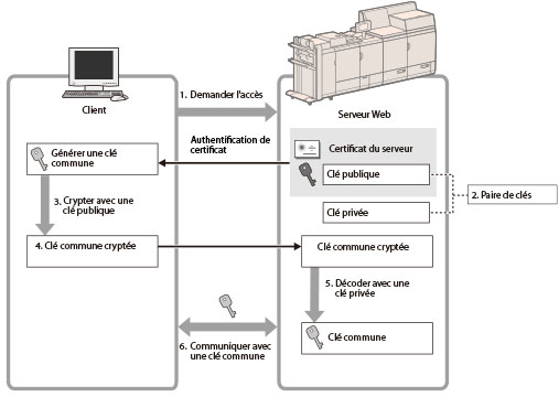 Il est possible de disposer d'une communication cryptée sûre lorsque l'utilisateur accède à la machine via un navigateur Web en installant un certificat de serveur sur la machine. Avec les communications TLS, la clé commune qui peut uniquement être utilisée par l'utilisateur et la machine est générée à l'aide du certificat de serveur et de la clé publique. Il est ainsi possible d'éviter l'interception et le vol de données. Voir
