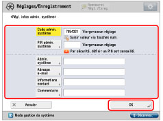 [Informations contact] : | Appuyer sur [Informations contact] → indiquer où contacter l'administrateur système → appuyer sur [OK]. |