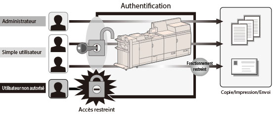 L'administrateur gère les utilisateurs en limitant l'accès par simple utilisateur et en définissant les restrictions par opération à l'aide du mode d'authentification. Les droits des simples utilisateurs peuvent être définis différemment par utilisateur. En bloquant l'accès aux utilisateurs non autorisés, les administrateurs peuvent limiter les risques de falsification de la machine et les fuites d'informations.