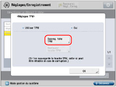 Avant l'activation du réglage TPM, l'administrateur système doit vérifier si les réglages par défaut du code administrateur système et du PIN système (réglages de l'administrateur système) sont modifiés. Si les réglages par défaut du code administrateur système et du PIN système ne sont pas modifiés, un utilisateur autre que l'administrateur peut effectuer des sauvegardes et la clé de sauvegarde TPM peut être prise. Etant donné que la clé TPM peut être sauvegardée une seule fois, il est impossible de la restaurer. Sauvegarder immédiatement la clé TPM sur la clé USB une fois le réglage TPM activé. Pour des raisons de sécurité, il est possible de sauvegarder la clé TPM une seule fois. Stocker la clé USB avec les données sauvegardées dans un endroit sûr. Noter également le mot de passé défini lors de la sauvegarde et le conserver dans un endroit sûr. La sécurité fournie par TPM ne garantit pas une protection complète des données et du disque dur. Canon ne sera pas responsable des incidents ou préjudices éventuels liés à l'utilisation de ce mode. Insérer la clé USB directement dans le port USB. Si la clé USB est insérée dans un angle ou si son type n'est pas conforme à la norme USB, il est possible que le port USB soit endommagé. Ne pas retirer la clé USB pendant la sauvegarde ou la restauration des données. Cela risquerait d'endommager la clé USB, les données qu'elle contient ou le port USB. De plus, si la clé USB est retirée au cours de la restauration, cela risque d'endommager la machine. |