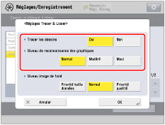 L'augmentation de <Niveau de reconnaissance des graphiques> augmente également la taille des données. Il est conseillé d'utiliser l'option [Normal], puis, si les résultats ne sont pas ceux escomptés, augmenter le niveau de reconnaissance avec les options [Modéré] et [Maxi]. |