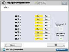 [Tenir compte de Couleur] : | Si défini sur "Oui", les réglages indiqués sous "Définition du choix automatique de cassette selon la couleur" sont appliqués. Si un papier est utilisé pour la copie couleur et un autre pour la copie monochrome, les sources d'alimentation papier spécifiées sont sélectionnables uniquement avec Sélection automatique du papier et Sélection auto. du compartiment papier. |