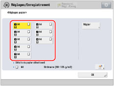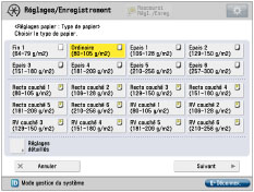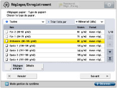 Il est possible de mémoriser les types de papier chargés ne figurant pas sur la liste des réglages détaillés. Pour plus d'informations sur la mémorisation des types de papier, voir "Présentation de cette fonction". Lors de la mémorisation d'un type de papier personnalisé comme source papier, les réglages du type de papier sont protégés et il est impossible de modifier les informations détaillées sur le type de papier personnalisé ou de supprimer le type de papier personnalisé sous [Réglages de gestion du type de papier] de [Préférences] (Réglages/Enregistrement). |
