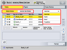 Appuyer sur [Tâche] → [Statut tâches] ou [Journal des tâches] → sélectionner le type de tâche sur la liste déroulante.