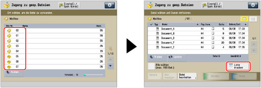 Auch wenn Sie die Liste der gespeicherten Dateien durch Berühren der Taste [Name] oder [Datum/Zeit] sortieren, wird die Liste der Dateien in der Reihenfolge ausgedruckt, in der sie in der Mailbox gespeichert wurden. |