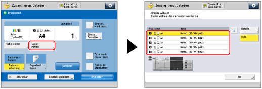 Wenn Sie die Taste [Details] berühren, werden detaillierte Informationen zum gewählten Papier angezeigt. Wenn Sie berühren, können Sie umschalten, ob die Geräteabbildung gezeigt werden soll. Weitere Informationen finden Sie im Abschnitt "Ändern der Standardanzeige für das Listendisplay Papier wählen ". |