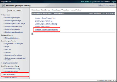 Klicken Sie auf der Portalseite von Remote UI auf [Einstellungen/Speicherung] → [Lizenz/Andere] → [Software speichern/aktualisieren].
