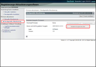 Berühren Sie nacheinander die Tasten [Firmware aktualisieren] → [Gepl. Ausgabe löschen].