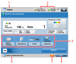 6. | Hier wird der Fortschritt von Aufträgen und Kopiervorgängen sowie der Status von Geräten und Verbrauchsmaterialien angezeigt. Darüber hinaus wird bei eingestellter Verwaltung per Abteilungs-ID die Abteilungs-ID angezeigt, die für die Anmeldung beim System verwendet wird. |