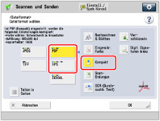 <PDF (Kompakt)> oder <XPS (Kompakt)> ist nur mit den folgenden Einstellungen gültig: Farbauswahl: Auto (Farbe/Grau), Vollfarbe, Graustufen Auflösung: 300 x 300 dpi Kopierfaktor: 100 % oder Auto |