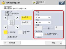 如果在 [复印套编排选项设置] 中将 <编排选项> 设置为“打开”,则 [全表面打印] 和 [5个位置的编号] 变灰且无法选择。(请参阅“复印套编排选项”) 如果在同一位置设置了 [页码编排]、[水印] 或 [打印日期] 中的任意两个进行打印,则按 (启动) 时将显示一条确认信息。 |