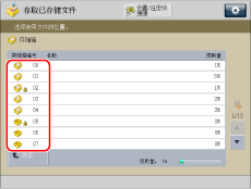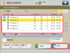 选定作业按指定顺序编号,并以此顺序打印。 可以通过再次选择该文件来取消选择。 要取消所有文件选择,按 [清除选择]。([清除选择] 变为 [选择全部(最多100份文件)])。 如果存储箱中存储了两个或更多个文件,可以按 [名称] 或 [日期/时间] 对文件列表排序。 如果排序文件后关闭存储箱,则下次打开存储箱时文件为未排序状态。 排序文件后,如果从计算机将文件存入存储箱或从存储箱删除文件,则更新的列表仍然保持排序状态。 如果选择文件的同时按 [名称] 或 [日期/时间],则该文件为未选中状态并且显示文件列表的开头。 |