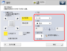 如果将 [编排选项] 设置为“打开”,[全表面打印] 和 [5个位置的编号] 会变灰并且无法被选择。(请参阅“复印套编排选项”) 如果在同一位置设置了 [页码编排]、[水印] 或 [打印日期] 中的任意两个进行打印,则按 (启动) 时将显示一条确认信息。 |