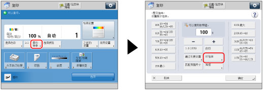 如果设置 [自动XY倍率],则使用“手动纸张选择”模式选择纸张尺寸。如果没有选择纸张尺寸,则会自动选择主机的右纸仓并根据该纸仓中添加的纸张尺寸设置复印倍率。 |