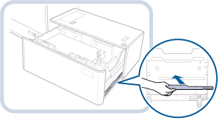 视情况而定,纸仓打开可能需要一定的时间。 只有在使用加长纸时才需要尺寸更改板固定支架。使用标准尺寸纸张时请将其拆下。此外,当所使用的纸张宽度小于 210 mm 时,无法使用该固定支架。 如果尺寸更改板固定支架已安装,请将其拆下,然后将其安装到指定的位置(纸仓右侧)。 ![]() |